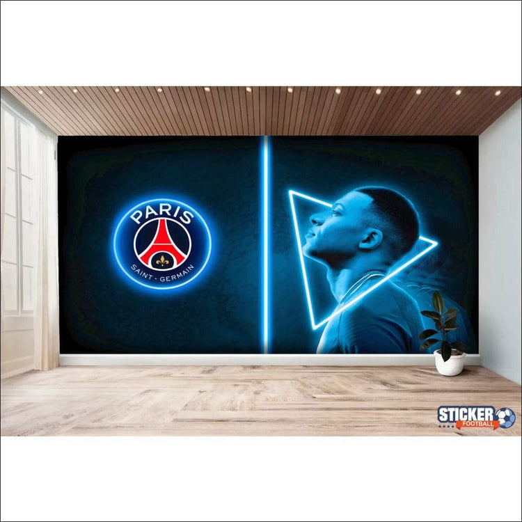 Totalmente a medida, imprimimos a tus medidas añadiendo 10 cm de contorno para un acabado perfecto de tu papel pintado Paris St Germain - MBAPPE efecto neón