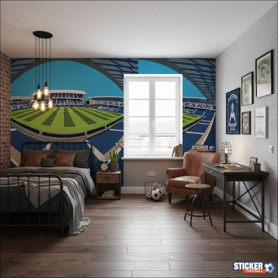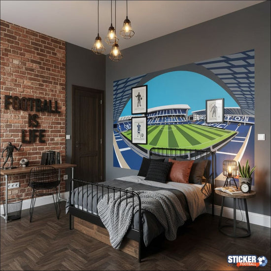 Chaque nuance de vert du gazon, chaque détail des tribunes et l'architecture grandiose du stade sont capturés pour recréer une atmosphère unique et vibrante. Que vous soyez un fan inconditionnel des Toffees, un amateur de football passionné ou simplement à la recherche d'une pièce maîtresse audacieuse pour votre décoration, cette fresque murale est conçue pour impressionner.
